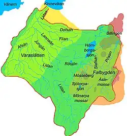 Lidan is a Swedish river in the historical province Västergötland and the current Västra Götalands län.[1] Lidan flows into Vänern by Lidköping and therefore the name of the city Lid-köping.[2] The river begins in the highland of Ulricehamn.[3] Asp is having the river as its habitat. The river is 93 kilometer long and its basin is 2.262 km².