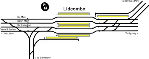 Lidcombe has six platforms: five for ordinary suburban services, and one for the shuttle between Lidcombe and Olympic Park – numbered as Platform 0 and known as the Olympic Park Sprint platform. During times of special events, some train services may make additional calls at Lidcombe.[11][12]