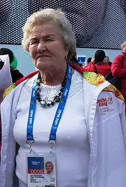 After her retirement in 1969, Skoblikova moved to Moscow to work as a speed skating coach at Lokomotiv. In 1973, she began her studies at The Academy of Labor and Social Relations and received a degree in pedagogy in 1979. She later earned a PhD in history and became a professor.[5] By 1983, she was a member of the Soviet National Olympic Committee, and received a silver Olympic Order from the hands of Juan Antonio Samaranch. For 12 years she was president of the Russian Skating Federation, and in the 1990s was the head coach of the Russian team. In 1996, she was inducted into the International Women's Sports Hall of Fame,[4] and three years later received the Order "For Merit to the Fatherland" from the hands of Boris Yeltsin.[6] On February 7, 2014, she was one of the six people who held the Olympic flag during the opening ceremony of the 2014 Winter Olympics in Sochi.