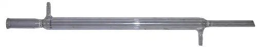 The modern design consists of two concentric straight glass tubes, the inner one being longer and protruding at both extremities. The ends of the outer tube are sealed (usually by a blown glass ring seal), forming a water jacket, and is fitted with side ports near the ends for cooling fluid inflow and outflow. The ends of the inner tube, that carries the vapor and condensed liquid, are open; they are often fitted with ground glass joints for secure and airtight connection to other equipment.