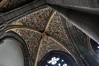In 1557 and 1558, major works were still carried out on the church. The first date can be found on the central window on the south side and on the vault in front of the large nave; it probably indicates the time of construction or repair of the windows on this side. The second is on the corresponding window on the north side.[alpha 9]