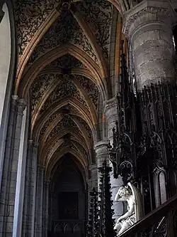 In 1530, by the munificence of Léon of Oultres,[18] the collegiate church was enriched by the large canopy illuminating the left arm of the transept at midday. This window escaped the ravages of the French Revolution. On the contrary, the one facing it was completely destroyed.[19]