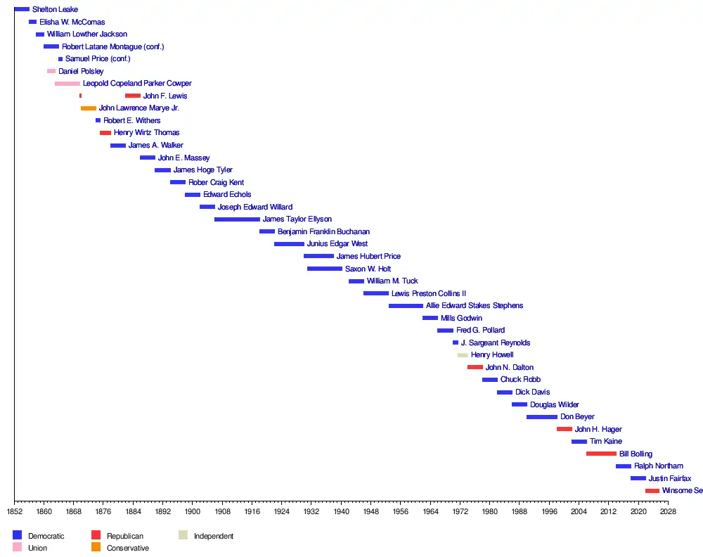 The Virginia Constitution of 1851 created the modern office of the lieutenant governor.[2] It provided for the popular election of the officer and designated them ex officio president of the Virginia Senate.[3] In this capacity they replaced the Speaker of the Senate, which had been chosen by the body's own members as their presiding officer from 1776 until 1852. During the American Civil War, Virginia had two different governments and accordingly different sets of lieutenant governors. From 1865 until 1870, the lieutenant governors were appointed by the commanding general of the First Military District. In 1870, Virginia was readmitted to the federal union and, from then on, the officers were chosen by popular election.[2] That year, the state adopted a new constitution which gave the lieutenant governor the power to cast tie-breaking votes in the Senate.[3]