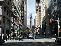 Principal photography began on 18 February 2014 in Toronto, Ontario, Canada and continued till 27 March 2014.[33][34] Pattinson filmed a scene in snow in Toronto on 18 February 2014.[35][36] On 20 February 2014, filming took place at 33rd Maitland Street in Toronto.[37] Filming took place inside and outside of a building in Downtown Toronto on 21 February 2014 with Pattinson, Kingsley and DeHaan.[38] Pattinson and DeHaan filmed scenes at the farm outside of Toronto on 26 February – 1 March 2014.[39][40] On 4 March 2014, filming took place downtown Millbrook near Peterborough at King Street, which was transformed into the 1950s era and at the Pastry Peddler shop which was transformed into a 1950s shoe store.[41][42][43] A rainy scene was shot in downtown Toronto on 7 March 2014.[44] On 8 March 2014, filming took place at Bay Street in downtown Toronto, which was transformed into 1950s New York City street.[45] On 11 March 2014, Pattinson and DeHaan shot a motorcycle riding scene in Toronto,[46][47] on a bike resembling a 1955 Trophy Triumph, James Dean's bike.[48][49] On 15 March 2014, filming took place at Victoria and King streets in downtown Toronto with Pattinson and Edgerton.[50][51] Scenes shot at 71 Gloucester Street Toronto on 20 March 2014.[52]
