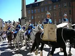 The Royal Swedish Cavalry Band (Swedish: Livgardets dragonmusikkår, LDK) is one of three professional military bands in the Swedish Armed Forces. The band traces its ancestry back to the 1500s when King Gustav Vasa raised his first regiment of horse. Today LDK is one of few mounted bands in the world. The band rides at the head of the Life Guards through Stockholm when mounting the King's Guard and the parade is considered one of Sweden's main tourist attractions. This band reports as part of the Swedish Armed Forces Music Corps, which is responsible for the formation and maintenance of Swedish military bands