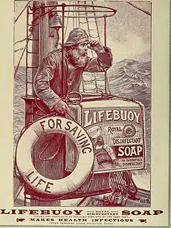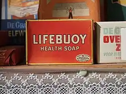 Lifebuoy was introduced by Lever Brothers in 1895 in the United Kingdom. Originally a carbolic soap containing phenol, different varieties were later introduced without the medicinal carbolic smell, such as the coral-coloured Lifebuoy during the late 1950s and Lifebuoy Minty Refresher in 1966.[2] Lifebuoy was one of the most popular soaps in the United States from approximately 1923 to the mid-'50s,[3] when perfumed soaps took over the market. It was North America's best-selling medicated/health soap until roughly 1951. It was well known for its red and yellow packaging, red color, octagonal shape, and carbolic aroma. Due to declining sales sometime in 1951 or 1952, Lever Bros. experimented with adding perfumes to the soap and made the changes permanent in 1954. Earlier experiments in 1936, 1938, 1939, and 1940 also added an artificial scent to the soap but generally lasted only one batch. Sales, however, continued to decline until 2006, when Lifebuoy was officially completely pulled from the American market. Lifebuoy's popularity reached its peak between 1932 and 1948. After World War II, when more materials were available, and rationing was over, other soaps began to take hold of the market. Its popularity waned steadily through the 1950s. It saw a popularity surge in the mid/late 1960s, which would last through 1973. This was partly caused by the introduction and success of Lifebuoy White in the American market. After this decline, the Lifebuoy brand was seen less and less in the American market. It was pulled from American shelves starting in 2003 and was completely phased out of the American market by 2006. Sometime in 2008 or 2009, Unilever released Lifebuoy Classic, a modern soap with retro packaging and a medicated scent intended to be similar to that of the 1950s product, as a tie-in novelty product sold through the official A Christmas Story website.