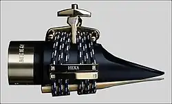A ligature is a device which holds a reed onto the mouthpiece of a single-reed instrument such as a saxophone or clarinet. The ligature must secure the reed firmly against the table of the mouthpiece while allowing it to vibrate freely.[1] The earliest ligatures were lengths of string wrapped over the reed and tied. Iwan Müller invented a metal ligature to replace twine.[2] String is still used by clarinetists, especially in Germany. Modern German mouthpieces have a groove cut into the outside of the mouthpiece to facilitate wrapping with a string ligature. Some modern clarinetists even opt to use shoestring as a ligature substitute as it is more easily adjustable than string.[3] Other modern clarinetists use electrical tape as a ligature.