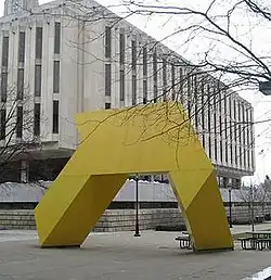 Light Up, often stylised as Light Up!, is a painted steel plate public art sculpture created by American artist Tony Smith and dedicated on May 15, 1974. The sculpture is located in the University of Pittsburgh's Forbes Quadrangle between Posvar Hall, the Barco Law Building, and Hillman Library. Commissioned in 1971 by Westinghouse Electric Corporation,[1] it was originally situated in Gateway Center in downtown Pittsburgh, but was donated to the University of Pittsburgh and relocated to its Oakland campus in 1988.[2] The sculpture was temporarily recited to the Seagram Plaza in New York City in 1998 for an exhibition of Smith's work at the Museum of Modern Art.[3]