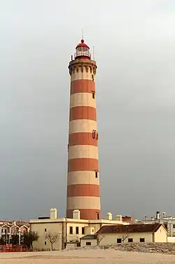 The Lighthouse of Praia da Barra, also known as the Aveiro Lighthouse (Portuguese: Farol de Aveiro/Farol da Praia da Barra), is an active lighthouse in the civil parish of Gafanha da Nazaré, municipality of Ílhavo, in the Portuguese district of Aveiro. Situated on the coastal Praia da Barra, at the southern margin of the Ria de Aveiro, it is the tallest lighthouse in Portugal, with a height of 203 feet (62 m)[2] overseeing the barrier beach and exposed to Atlantic storms. It is open to the public and visits are held on Wednesdays from 14:00 to 17:00.