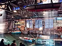 After the pre-show, the audience still keeps to their 3 separate rows, enter the main sound stage, which is modelled after the interior of a boathouse in New York City (Shanghai for the Beijing version). Once the command to roll cameras has been given, a news broadcast will be shown about the hurricane or typhoon, urging the audience to remain calm, the sky (a projection of the NYC or Shanghai skyline outside the boathouse windows) darkens, thunder and lightning fill the room, heavy rain pours through the ceiling, and the audience is immersed in various effects such as strong wind, intense fire, signboards crashing through the roof, the boathouse windows blowing away, movement of the platform they are standing on, and a huge cargo ship (coming from the left in Singapore and right in Beijing) slamming through the boathouse entrance. This part of the show lasts approximately 3 minutes. Once the show is over, the audience exit the sound stage and emerge into the New York zone of the theme park.