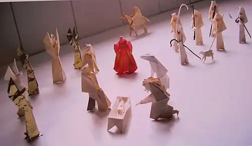Ligia Montoya's own designs are, in subject-matter, drawn from close observation of nature: notably birds, flowers and insects typical of Argentina. Her models are exact, fine and lively, expressing the shapes and creases of her thin, crisp and strong, white airmail paper (always) in the living forms it represents. Her origami Nativity crèche scene is an outstanding example. Ligia Montoya was long the only Spanish-speaking member (honorary) of the Origami Center. Robert Harbin's extended section on Montoya in his 1971 Secrets of Origami[7] is the main source for her designs. Harbin, who there called her "the foremost woman paper-folder today", continued: "Her creations, which are innumerable, range from simple figures of birds and flowers to fantastically difficult insects. Her work is sensitive and ingenious, and her generosity in passing on her secrets to others is widely known. My great regret is that nobody will ever be able to set down on paper, or put into diagram form, the whole of her work."