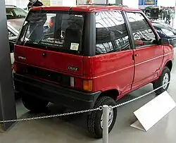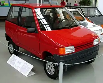 The car received a thorough facelift in November 1989, with orange front turn signals which wrap around the corners, and the name was changed to Ligier Optima.[3] Initially, only the 265 cc diesel engine was on offer,[3] but later there was also an Optima/Optimax Twin available. The two-cylinder versions received front disc brakes. A van with a built-out, boxier rear end along the lines of the Renault Express or the Citroën C15, was also available under the name Optimax. AutoTechnik Walther (ATW) kept on offering a 49-cc version with a German Sachs engine, to meet local needs for permitless operation.[4] ATW also developed a version with an electric motor, which they installed in their Bad Rappenau facilities.[5] This version used the 10-inch wheels and drum brakes all around, period testers found this insufficient for a car which was 2.5 times the weight of the original and able to reach speeds of over 100 km/h (62 mph) in Power mode.[5] The price was also elevated - with a few options, the price could easily reach DM 40,000 in 1993, equivalent to $53,187 in 2024 and the same as a base model Audi 100 at the time.