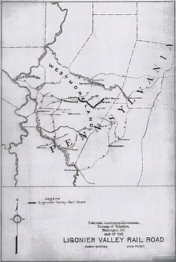 The Ligonier Valley Railroad (reporting mark LGV)[1] connected the communities of Latrobe and Ligonier, Pennsylvania, approximately 10 miles (16 km) apart, between 1877 and 1952. For much of its length, the railroad ran parallel to Loyalhanna Creek in a scenic mountain gorge. In addition to the Latrobe-Ligonier line, there was an extension to the coal mining communities of Wilpen and Fort Palmer to the north of Ligonier, as well as several shorter spurs serving coal mines.