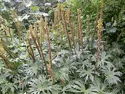 Growing to a height of 1.5–2 m (4.9–6.6 ft), Przewalski's ligularia is a popular ornamental plant cultivated for its large, deeply cut foliage and tall spike-like inflorescences with bright yellow composite flowers. It blooms in summer, from July to August.