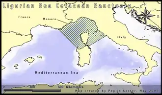 The sanctuary is located in the Ligurian basin of the Mediterranean Sea. In this area all the cetaceans occurring in the Mediterranean can be found at regular intervals. It is believed to be the main feeding ground for Fin Whales in the Mediterranean basin.