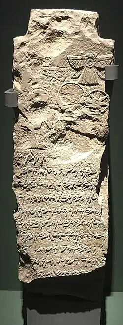 Some parts of the text are difficult to read. F. M. Cross has read the third line and last word of the second line as: br [m]lk {z} lḥyn (‘son of the king of Lihyan’), while others have read it as: br [m]lky lḥyn (‘son of the royal official of Lihyan’).[46] Although the text does not explicitly mention Lihyanite control over Taymāʾ, pṣgw šhrw was likely the governor (pḥt) of the city on behalf of the Lihyanite king.[17] In any case, the text proves the existence of the Lihyanite kingdom when it was written—which probably extended to Taymāʾ— before the mid-4th century BC as indicated by radiocarbon dating of bone samples from the main phase of the shrine where the stele was found in a clear archaeological setting.[46] Indeed, the stele exhibits a distinct Egyptian influence through iconography, featuring motifs like the Udjat eye and the winged sun-disk.[46] Similarly, al-Ḥamrāʾ cube, found in the same context, also displays strong Egyptianising elements. However, by examining the archaeological context of these findings, it becomes evident that the Egyptian influence predates the Hellenistic period.[46] In fact, there are no clear signs of contact with Egypt in Taymāʾ during the last three centuries BC.[46] This observation casts more doubt on the notion that the kingdom of Lihyan coexisted with the Ptolemies. While Lihyanite sculptors drew inspiration from Egyptian models, it's plausible that these models predate the Ptolemaic era.[46]