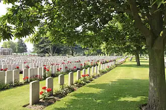 The cemetery is organised into 35 sections (Plots I-XXXV) and contains a total of 10,785 graves, of which 35 are unnamed (for a war cemetery of this size, this is a relatively small number). All but 41 of those buried here are war casualties who died while being treated at the medical facilities in the area during the period 1914–1919.[4] There are 9,901 graves of soldiers from the United Kingdom, Canada, Australia, New Zealand, South Africa and India[1] (24 of the 9,901 Commonwealth war dead are unidentified),[2] and 883 graves of soldiers from 30[6] other nationalities including France, Germany and the United States[1] (11 of these 883 war dead are unidentified).[2] Eight of the headstones are memorials to men known to be buried in this cemetery, these are located in Plot XXXII near the Stone of Remembrance.[2] A section with 35 graves is for workers of the Chinese Labour Corps who died in the area of Ypres and Poperinge during and just after the First World War. The Chinese Labour Corps was recruited during the war by the British government to free troops for front line duty by performing support work and manual labour. In this role, the Chinese Labour Corps cleared battlefields, dug graves as well as trenches and carried out other such tasks which were often difficult and dangerous.[4]