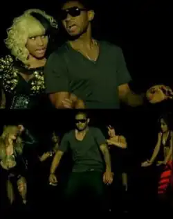 On Minaj and her pairing with Usher, Stansberry said, " [Nicki] had a few looks that I really liked. She played the part, but still was her. If you really listen to her words in the song, you can kinda visualize her outfit."[19] Stansberry also confirmed that R&B singer Ciara and singer-actor Jamie Foxx would make appearances in the video.[19] In an interview with MTV News on the set of her video for "Massive Attack", Minaj said that "The video is freaky. And it's a great concept, a great story line," Minaj told MTV News. "It felt just like one of the sequels to Saw. It was dope."[20] Stating that the video had a "secret society" concept, Usher told Access Hollywood that the place symbolized locations where people use to get away from pressures, and also said the movie Eyes Wide Shut was some sort of inspiration of the video.[3] On March 22, 2010 a thirty second preview of the music video was surfaced onto the internet.[21] Two days later on March 24, 2010, Usher premiered the full music video on BET's 106 & Park.[22]