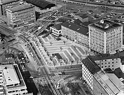 Further discussed within Robert Trancik’s case study in his text “Finding Lost Space”, is the infill construction that restored the large area of which the Lillla Bommen building presides today. The prior highway interchange that predominated the large area that new infrastructure at the waterfront of the Göta Canal was remodelled to accommodate the reclamation of unused “Lost space” as referred to by Transik. The area named the Järntorget (The Iron Square), composed largely of roadwork was the result of infill and highway restructuring in the area, aimed at improving the waterfront aspect of the Lilla Bommen region. The historical redevelopment of the Järntorget region acted as the foundation for which the Lilla Bommen building was constructed allowing for the reinstatement of the inner-city to waterfront region as its prominent modern day commercial and residential district.[5]