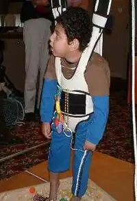 The HOPSA-dress provides vertical orientation, without the need for weightbearing, to children with multiple disabilities. Items with interesting textures can be placed near the feet for tactile stimulation. Later, the pulley system can be adjusted so that the child can bear weight gradually, at their own pace.