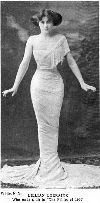 She began her career on stage in 1906, aged 12 or 14. The following year, she appeared as a minor performer in a Shubert production, The Tourists. It was in that show that she was discovered by Florenz Ziegfeld. At some point she had become known as Lillian (or Lillie) Lorraine. He spent the next several years promoting her career, rocketing her into an ascendance which made her one of the most popular attractions in his Follies.[4] In 1909, Ziegfeld pulled the teenaged Lorraine from the chorus line in that year's production of Miss Innocence to spotlight her as a solo performer who became celebrated for introducing the song "By the Light of the Silvery Moon".[5]