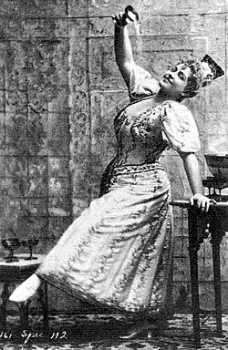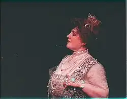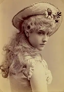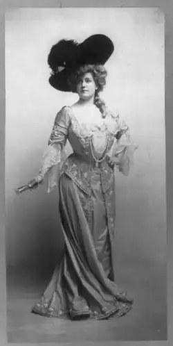 Russell continued to star in comic opera and other musical theatre. She toured with the J.C. Duff Opera Company between other engagements for two years beginning in 1886.[5] In 1887, she starred as Carlotta in Gasparone by Karl Millöcker in New York City at the Standard Theatre, together with Eugène Oudin and J.H. Ryley.[20] Later the same year, she was back at the Casino Theatre in the title role of Dorothy, and over the next several years, she continued to star in operettas and musical theatre on Broadway. Her parts at this time included the title role in The Grand Duchess of Gerolstein, Fiorella in The Brigands (in a translation by W.S. Gilbert), Teresa in The Mountebanks, Marion in La Cigale, and Rosa in Princess Nicotine.[4][21] In 1891, she opened at the Garden Theatre as the star of the Lillian Russell Opera Company.[5] Giroflé-Girofla was a favorite of Russell, who played the dual lead role in Chicago, New York and on tour in the 1890s.[22]