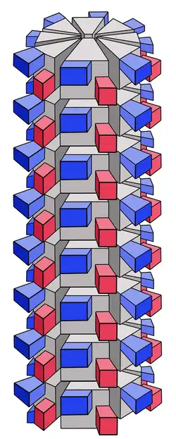 Virus particles (virions) of the Lily mottle virus consist of a thread-like capsid with helical symmetry, in which a single-stranded RNA is packed as a genome; a viral envelope is not present.[3] The capsid is 13 nm thick and about 740 nm long. The length of the capsid increases in the presence of divalent cations (especially calcium ions) in the preparation and decreases after binding by the addition of EDTA. The individual capsomeres that make up the capsid require a pitch of 3.4 nm for one helix turn. Compared to viruses with rigid rods and a comparable structure (e.g. the Tobacco mosaic virus- TMV), this duct height is relatively large and enables the LMoV capsid to be flexible and bendable. One turn requires 7.7 capsomeres, so that the entire capsid is composed of about 1700 capsomeres.[4] The individual capsomeres consist of only one molecule of the LMoV capsid protein (CP, coat/capsid protein) with a length of 274 amino acids (33 kDa). The CP is folded several times in such a way that the N- and C-terminus point outwards. These outer ends of the capsid protein are very variable. The protruding N-terminus mainly determines the specific attachment to the host cell and enables the serological differentiation of different virus isolates. The highly conserved sections in the middle of the CP (216 amino acids) within the different members of the Potyviridae point inwards in the capsid and interact with the viral RNA.[5]