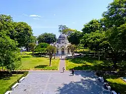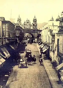 Gate of the colonial wall of Lima, the "Arco del Puente" its partially wooden structures were consumed by a fire caused by street vendors in 1879.[40] The colonial wall of Lima had ten gates,[41][40] now demolished.