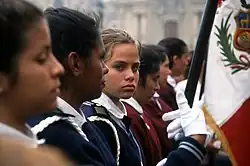 The Flag of Lima is historically known as "Banner of the City of the Kings of Peru". It is formed by a golden-colored silk canvas and in the center is the embroidered coat of arms of the city.[13]