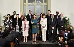 On 4 February 2019, in a meeting in Canada, it was agreed to include Juan Guaidó's interim government as a member of the Lima Group.[38] Previously, Guaidó has designated Julio Borges as ambassador of the Lima Group.[39] On the day of Maduro's second inauguration as president of Venezuela (10 January), Canada's Minister of Foreign Affairs Chrystia Freeland, one of the leading voices in the Lima Group, issued a statement that summarizes the Canadian government's position on Venezuela: "Today, Nicolás Maduro's regime loses any remaining appearance of legitimacy. Having seized power through fraudulent and anti-democratic elections held on 20 May 2018, the Maduro regime is now fully entrenched as a dictatorship. The suffering of Venezuelans will only worsen should he continue to illegitimately cling to power. Together with other likeminded countries in the Lima Group, Canada rejects the legitimacy of the new presidential term of Nicolás Maduro. We call on him to immediately cede power to the democratically-elected National Assembly until new elections are held, which must include the participation of all political actors and follow the release of all political prisoners in Venezuela."[40]
