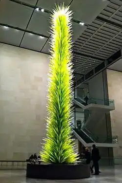 Working with his team of glassblowers, Chihuly designed Lime Green Icicle Tower specifically for the Shapiro courtyard.[3][2] The artwork, which measures 42.5 feet (13.0 m) high and 7 feet (2.1 m) wide, features 2,342 pieces of blown glass and weighs approximately 10,000 pounds (4,500 kg).[4][5] Andrea Shea of WBUR-FM described the color of the sculpture as Kermit the Frog.[6] Journalist John O'Rourke of Boston University described Lime Green Icicle Tower as an "exotic, neon-hued palm tree that has taken root in a giant greenhouse" while Judith H. Dobrzynski of The Wall Street Journal described it as a "cross between a cactus and a poplar tree."[1][7] Although Sebastian Smee, Pulitzer Prize-winning art critic for The Boston Globe, is not a fan of Chihuly's work in general, he praised the sculpture. Smee stated: "I defy anyone not to like it" and the sculpture is "so good it's hard to imagine that Malcolm Rogers, the MFA's director, will not find a way to keep it there long term."[8][9]