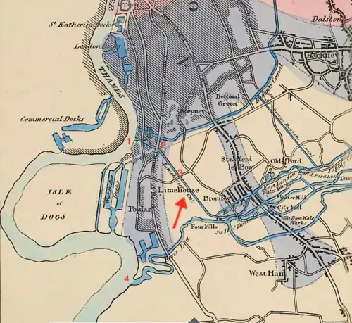 Near its Limehouse end the Cut was widened to form a basin with an island in it. This was the first Limehouse basin, made 25 years before the better known Regent's Canal Dock. The reason for this is described below, see "The Island in the Cut and its mills".