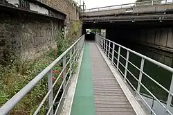 Britannia Bridge is where the Commercial Road crosses the Cut. It was named after the Britannia Tavern (c.1770-1911), which can be found in Horwood's 1819 map[67] and is visible in the image Limehouse in 1809 (above, "Further widening"), left background. The original bridge cramped the Cut and interrupted its towpath.[68]
