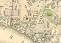 At about this time the Lee trustees, who were afterwards alleged to be too cosy[55] with the Regent's Canal Company, agreed to sell it the southern portion[56] of the Limehouse Cut. Since it was public trust property it could not be done without the sanction of Parliament, to whom a Bill was presented.[57] The nearby Regent's Canal Dock, already enlarged to a 9-acre basin, was crowded with shipping so the Company intended to enlarge it further, absorbing Limehouse Cut's lock and the remnants of its basin.[58]