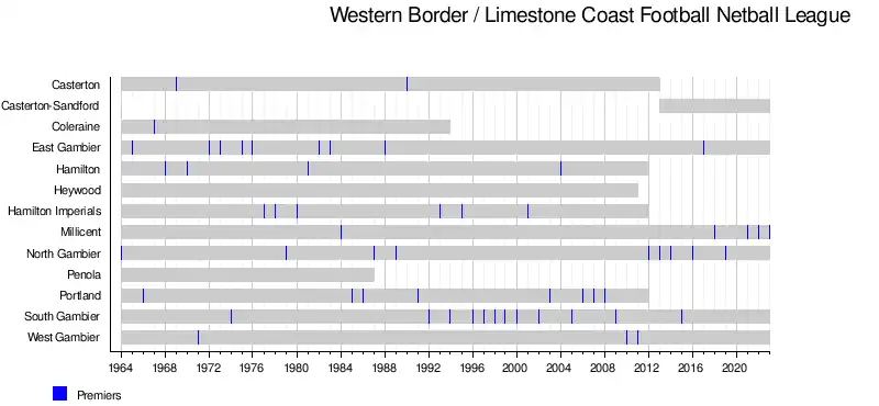 In late 2023, it was announced that the WBFL would be wound up and replaced by the Limestone Coast Football Netball League for the 2024 season. It was also announced that for the 2025 season, one club each from the Kowree Naracoorte Tatiara Football League and the Mid South Eastern Football League would transfer to the competition.[3]