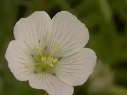 Limnanthes alba is a species of flowering plant in the meadowfoam family known by the common name white meadowfoam. It is native to California and Oregon, where it grows in wet grassy habitat, such as vernal pools and moist spots in woodlands. It generally grows in poorly drained soils. It is an annual herb producing an erect or decumbent stem up to about 30 centimeters long. The leaves divided into several lobed or unlobed leaflets. The flower is cup-shaped with white petals 1 to 1.5 centimeters long.