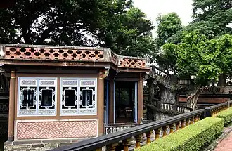 Up to between 1846 and 1848, to make the storing of rent crop more convenient, Lin Pinghou's third son, Lin Guohua, and fifth son, Lin Guofang, built Biyiguan (弼益館) in the Banqiao area as a "rent house" (租館).[1] This building had a surface area of roughly 150 ping (500 square metres or 5,400 square feet), with a uniquely shaped, quadrangular courtyard, sporting pavilions on its front and back, and served as a center for the collection of rent crop.