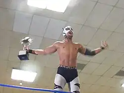 Dorado would return to the ring in January, teaming with Claudio Castagnoli and Ophidian to defeat Mike Quackenbush, Tim Donst and Amasis in a Trios Increibles match.[13] During the match, Dorado utilized a more grounded style of wrestling instead of his usual high flying style. Dorado then entered the King of Trios tournament, where he rejoined El Pantera and aligned with luchador Incognito to form Los Luchadores de Mexico. The team would go on to win the tournament, lastly defeating The BLKOUT (Eddie Kingston, Ruckus and Joker) after Dorado made Kingston submit with the Chikara Special.[14] Following the tournament, Kingston was not seen for a couple of months afterwards. When Kingston returned, he immediately targeted Dorado and defeated him several times but was repeatedly unsuccessful in keeping him down, driving Kingston to the point of total insanity. Aside from his feud with Kingston, Dorado joined former enemy Jimmy Olsen (who, at the time, began competing as both himself and as the second Equinox) and Helios to form The Future is Now in order to feud with The UnStable (Vin Gerard (the first Equinox), STIGMA and Colin Delaney). In late 2008, Olsen (as Equinox) and Dorado won the first-ever La Lotería Letal and were thus granted the three points required to compete for the Campeonatos de Parejas. Olsen (as Equinox) and Dorado, challenged the champions The Osirian Portal at Chikara's "Armdrags to Riches" event on November 16, 2008, in a two out of three falls match. Although Dorado gained the first pinfall, the Portal ultimately retained the title after pinning Dorado and then Equinox.[15] On November 22, 2009, at the season eight finale Three-Fisted Tales Dorado challenged Player Dos for the Young Lions Cup, but was defeated after Dos German suplexed him on the ring steps. After the match Dorado was carried backstage by Equinox and Helios in a scene reminiscent of the events of two years prior.[16]
