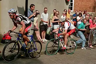 The 1977 edition was just as good a race with a breakaway group formed early in containing all the race favourites; however, it had a slightly chaotic finish. A junior race that was happening at the same time as the main Lincoln GP had just received their bell for the last lap, at which point, the race leaders came through the finish line approximately 30 seconds later. It was apparent to the organisers that the leaders of the men's race and remains of the break away would catch the juniors, so after a re-think the organisers added a 1 mile extension, leaving some of the seniors, including Dave Cumming, confused and temporarily losing contact with the race.[30] Dave Cumming managed to out sprint Steve Lawrence and the remaining group to take the win.[31] Ian Hallam placed 3rd yet again.[31] At this point Steve Lawrence, who was riding for VC Olympia Sport at the time, had finished in both places other than first, on the podium.[32] In 1978 he finally took the win, after working hard to chase down Scottish rider Robert Miller was 30 seconds ahead entering the last lap. Miller dropped to 5th by the time the line came around again, after being caught by Lawrence and a number of other riders.[33]