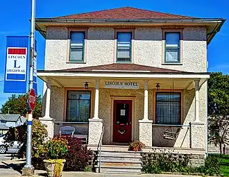 The Lincoln Hotel is a historic building located in Lowden, Iowa, United States. It was listed on the National Register of Historic Places in 1996.[1] The Lincoln Highway was established in 1913 and passed through Lowden. This hotel was built in 1915 to accommodate the travelers that passed through town.[2] Celia Clemmens, who operated the railroad hotel in town, and her husband A.F. Clemmens built and operated this hotel as well. The hotel is a two-story, rectangular structure with an exterior covered with pebble dash stucco. The shallow-pitched hip roof, wide eaves and the stucco finish reflect the influence of the Prairie School, while the Tuscan columns on the porch and crown window moldings reflect the Neoclassical style.[2] Off the front porch the first floor housed a small lobby, guest parlor and dining room, and the owner's living quarters. The second floor housed the twelve guest rooms and two bathrooms. A first floor addition built in 1920 to increase the size of the owner's quarters has subsequently been removed. The Lincoln Highway in Iowa became U.S. Route 30 in the 1920s, and it was realigned in the mid-1950s just to the south of Lowden. The hotel was able to stay in business until 1981. The building sat empty for the next twelve years before it was converted into apartments from 1994 to 1995.
