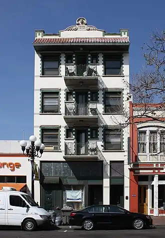 This four-story, steel-framed building features distincitive architectural treatment. Conveyed through a red clay tile roof and decorative white glazed ceramic tile on the facade. It was used initially as a wine business on the first floor with a hotel above. The building features a flat roof with a slightly stepped parapet and concrete pediment cast with the date of construction. A lion's head was originally on the parapet, but fell during a 1986 earthquake, and was quickly taken by passerby.