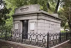 By 1864, the city council had decided to add all the 120-acre (0.49 km2) cemetery lands north of North Avenue to the park by relocating the graves. The cemetery sections south of North Avenue were also relocated but this land was left for residential development. An estimated 35,000 people total were buried in the cemetery sections of the park, and the plan required the removal of these graves to other newly opened cemeteries further from the city and lake.[10] To this day, the Couch mausoleum can still be seen as the most visible reminder of the history as a cemetery, standing amidst trees, behind the Chicago History Museum. Ira Couch, who is interred in the tomb, was one of Chicago's earliest innkeepers, opening the Tremont House in 1835. Couch is believed to not be the only person interred in the old burial ground in Lincoln Park. A plaque placed nearby states that "the remains of six Couch family members and one family friend are in the tomb."[11] Partially due to the destruction of the Chicago Fire of wooden burial markers, it was difficult to identify many of the remains. As recently as 1998, construction in the park revealed more bodies left over in the nineteenth century burial ground.[12]