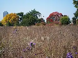 In the Uptown neighborhood (4400 N; 41°57′48″N 87°38′00″W / 41.96333°N 87.63333°W), there is the 15-acre (6.1 ha) Montrose Point Bird Sanctuary (including "The Magic Hedge").[34] During the Cold War, Montrose point, which juts out into Lake Michigan, was used by the United States Army as a Nike missile base.[35] The Army camouflaged their missile launchers and barracks behind honeysuckle hedges.[34] When the Army left in the 1970s, bird watchers noticed how the honeysuckle attracted birds. They successfully lobbied the park district for a new preserve. After extensive replanting, the site supports woodland, tall prairie, and lake dune habitat that annually attracts tens of thousands of migratory birds of more than 300 different species.[36] The Uptown Natural Area, opened in 2022, features nature trails through six acres of native prairie and savanna.[37]