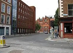The street has a number of notable buildings, including the Dublin Dental University Hospital[11] and Lincoln Chambers.[12] Two of the street's buildings were mentioned in James Joyce's Ulysses: Sweny's Pharmacy[13] and the Victorian Turkish Baths.[14] Merrion Hall terminates the vista from the south on Merrion Street Lower while Oriel House frames the corner of Lincoln Place, Westland Row and Merrion Street Lower.
