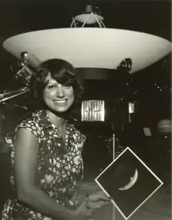![]() Morabito pictured after her discovery of Io volcanism, in front of a model of the Voyager spacecraft at NASA's Jet Propulsion Laboratory. She is holding a print of the image that enabled her to make the discovery. | |