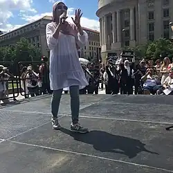 In September 2018, Sarsour announced that she would lead the 2019 Women's March on Washington along with Tamika Mallory, Bob Bland, and Carmen Perez.[42] Later that year, Sarsour and Mallory became the focus of a controversy over their perceived refusal to clearly condemn Nation of Islam leader Louis Farrakhan, whose rhetoric has been deemed antisemitic and homophobic by the Southern Poverty Law Center and the Anti-Defamation League.[43] In November 2018, Teresa Shook, the march's founder, called for Sarsour and her fellow co-chairs to step down, accusing them of having "allowed anti-Semitism, anti-LBGTQIA sentiment and hateful, racist rhetoric to become a part of the platform by their refusal to separate themselves from groups that espouse these racist, hateful beliefs."[44] Sarsour refused, suggesting the criticism of her was due to her support for BDS and that criticism of Mallory was due to racism. She later apologized to supporters of the march, expressing regret that she and Mallory did not "make their commitment to combating antisemitism clear." She also apologized to the March's LGBTQ and Jewish members, saying that she valued them and would "fight" for them.[45][46] Sarsour stepped down from the Women's March organization in September 2019 along with Bob Bland and Tamika Mallory.[2]