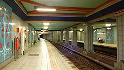 Lindauer Allee is a Berlin U-Bahn station located on the U8 in Berlin, Germany. Designed by Rainer G. Rümmler, the station opened on 24 September 1994, as part of the extension of the U8 to Wittenau. The station is tiled in green, violet, light blue and yellow with trees depicted on the walls as a reference to road's name Lindau where Lindenbaum = lime tree, Lindau is a town at Lake Constance. Mentionable is the gallery with the balustrade from where the whole station is visible. The only similar galleried view in Berlin is at the station Rathaus Spandau.[1]