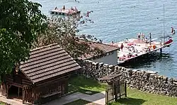 Endingerhorn fortification and medieval town hall at the Einsiedlerhaus building, as seen from ZSG paddle steamer Stadt Rapperswil