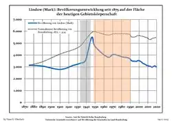 From 1815 to 1945, Lindow was part of the Prussian Province of Brandenburg. Lindow lived through the changes after the First World War and the takeover by the Nazis in 1933. Between September 1937 and the end of 1944 the SS organisation Lebensborn ran the home Kurmark in Klosterheide, a component village of Lindow north of the town.[13][14] The widow of the Music Professor Zeidler was deported to Theresienstadt after her husband's death in 1942 and perished there. She was a Protestant of Jewish descent, and lost her previous precarious protected status of a so-called privileged mixed marriage when her husband died.[15]