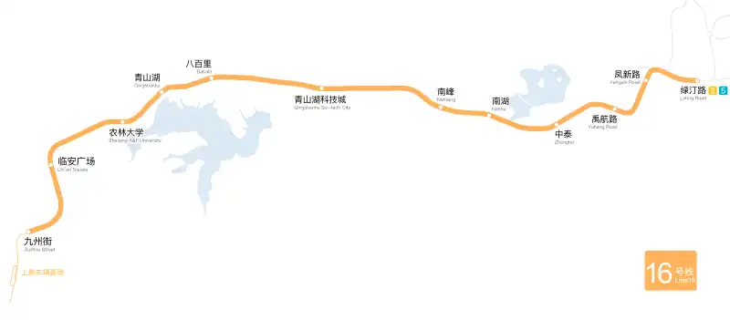 Line 16 of the Hangzhou Metro (Chinese: 杭州地铁16号线; pinyin: Hángzhōu Dìtiě shíliù hào xiàn)[3] is a metro line running east–west from Lvting Road in Yuhang District to Jiuzhou Street in Lin'an District. The total length is 35.12 km (21.82 mi).[1] The line is colored light orange on system maps. The line began construction in early 2016[4] and opened on 23 April 2020.